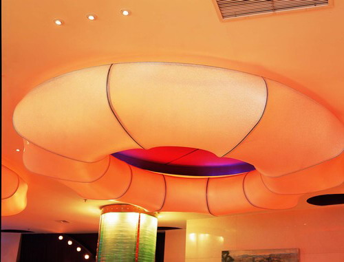 软膜天花--在十九世纪始创于瑞士,95年引入中国,经我国引进。这是一种近年被广泛使用的室内装饰材料。软膜需要在实地测量出天花尺寸后,在工厂里制作完成。软膜尺寸的稳定性在摄氏 -15 度到 45 度。透光膜天花可配合各种灯光系统(如霓虹灯、荧光灯、LED灯)营造梦幻般、无影的室内灯光效果。
